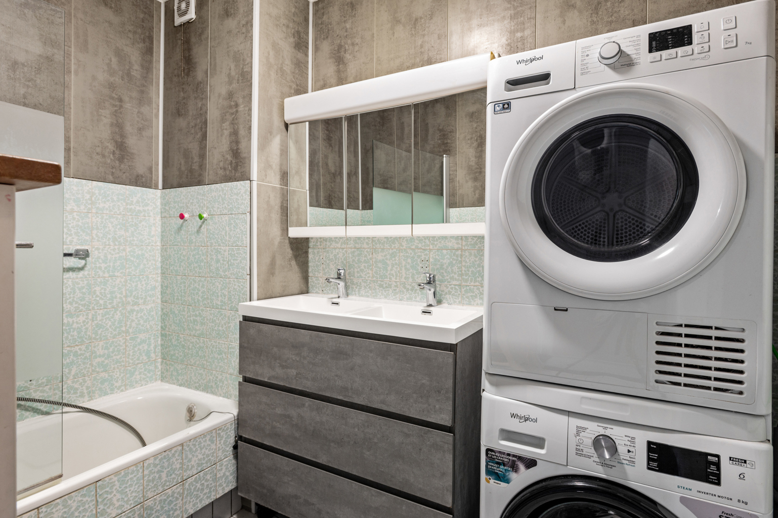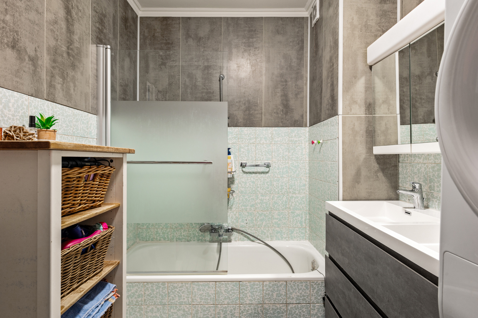 Via de hal komen we in de badkamer terecht met een ligbad, lavabo en plaats voor je wasmachine en droogkast.