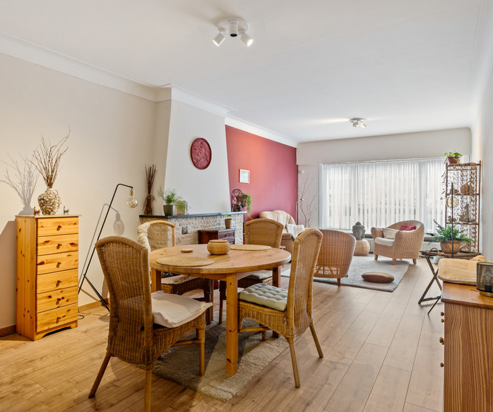 De woonkamer is voorzien van een laminaatvloer en geeft uit op de hall waarbij je toegang hebt tot de keuken met ingemaakte toestellen zoals een gasvuur, aanrecht met spoelbak, vaatwasser en een frigo.