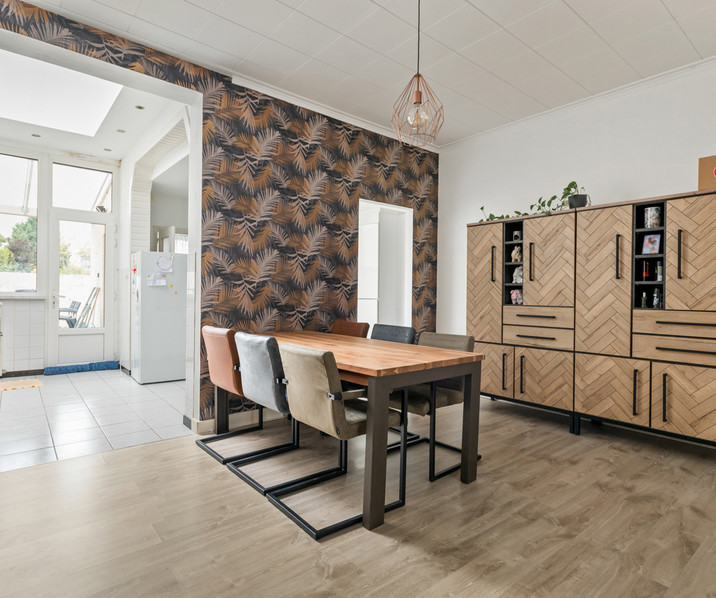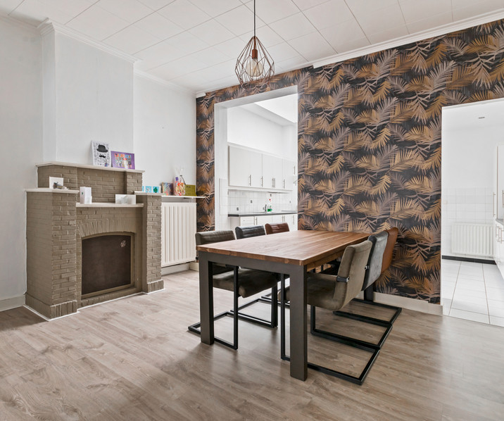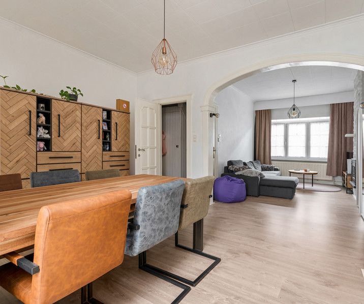 Het gelijkvloers is voorzien van een gezellige woonkamer met veel lichtinval vanaf de straatzijde en de keuken.